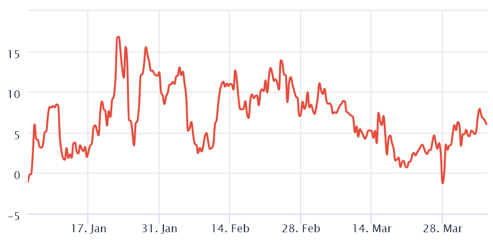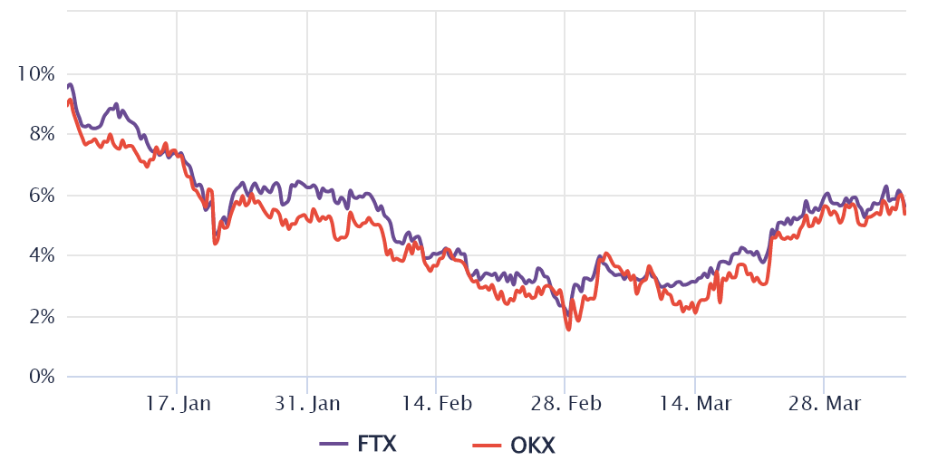 Biểu đồ trên cho thấy số liệu này giảm xuống dưới 5% vào ngày 11 tháng 2, phản ánh sự thiếu nhu cầu của các trader đối với các vị trí đòn bẩy long (tăng). Tâm lý thay đổi vào ngày 26 tháng 3 sau khi lãi suất cơ bản lấy lại ngưỡng 5% “trung lập”. Mặc dù điều này xảy ra, không có dấu hiệu tin tưởng từ các nhà giao dịch chuyên nghiệp, theo phí bảo hiểm tương lai.