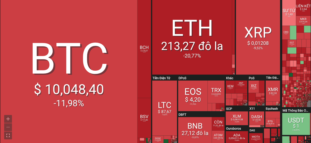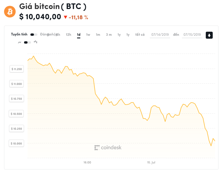 Giá bitcoin hôm nay ghi nhận vào thời điểm 8h00 ở mức 10.040 USD, giảm 11,18% so với 24 giờ trước.
