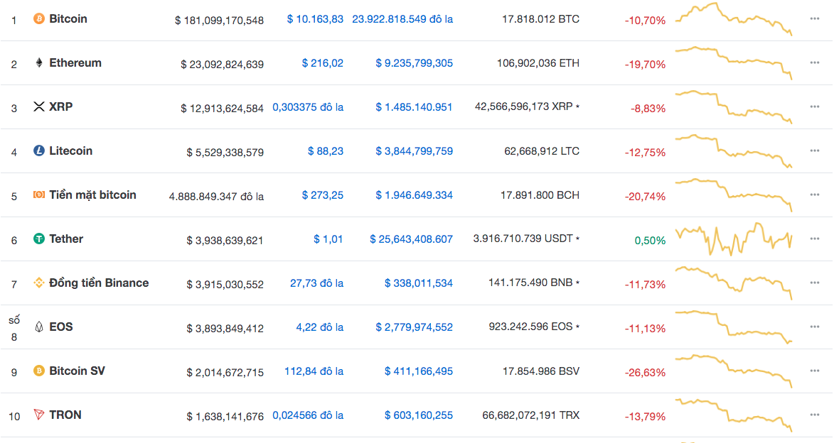 Trong đó, Bitcoin SV giảm mạnh nhất trong top 10 với tỷ lệ 26,63%. Tiếp theo là Bitcoin cash với tỷ lệ giảm giá 20,74%, còn 273,25 USD. Thứ ba là ethereum với tỉ lệ giảm giá 19,70%, ghi nhận mức giá 216,02 USD.