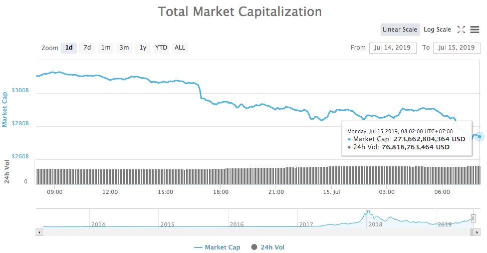 Tổng giá trị thị trường ghi nhận vào thời điểm 6h17 ở mức 273,851 tỉ USD, giảm 37 tỉ USD so với 24 giờ trước. Để so sánh, một tháng trước, tổng giá trị thị trường ở mức 271,84 tỉ USD. Dường như thị trường đang xóa bỏ những gì đạt được trong 1 tháng qua.