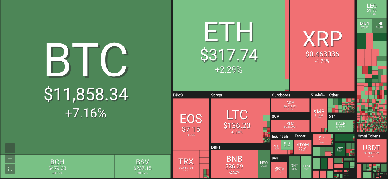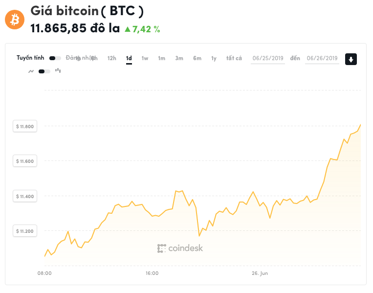 Giá bitcoin hôm nay 26/6 ghi nhận vào thời điểm 7h30 ở mức 11.865,85 USD, tăng 7,42% so với 24 giờ trước.