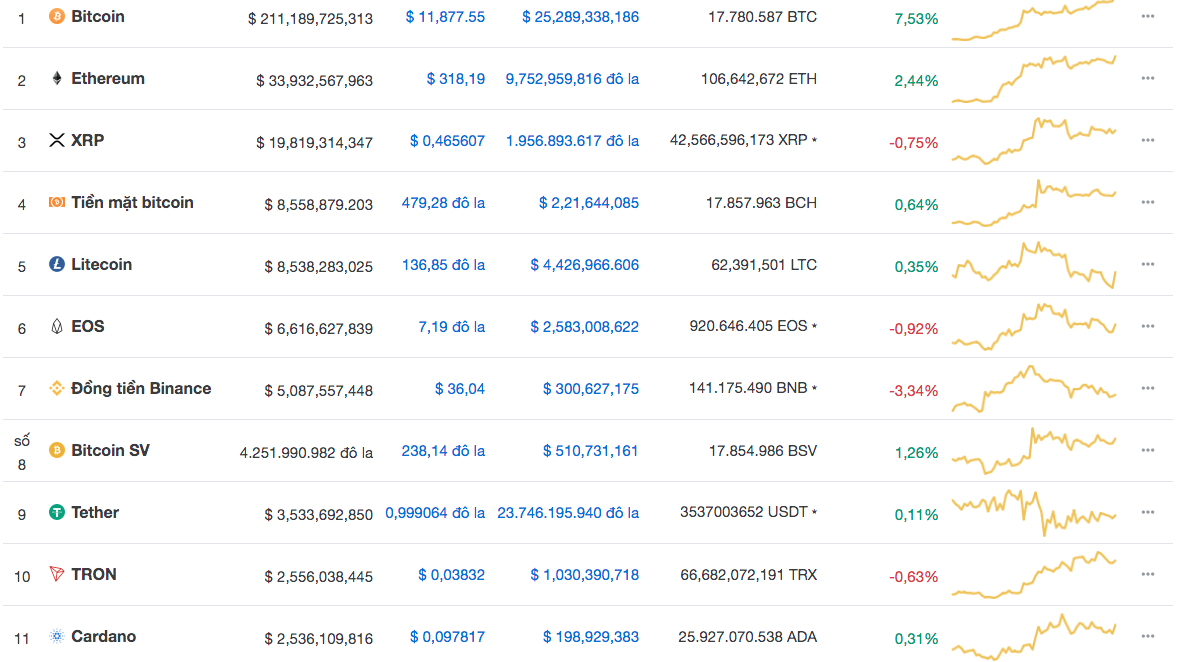 Trong khi đó, eos và binance coin lần lượt giảm với tỉ lệ 0,92% và 3,34%.