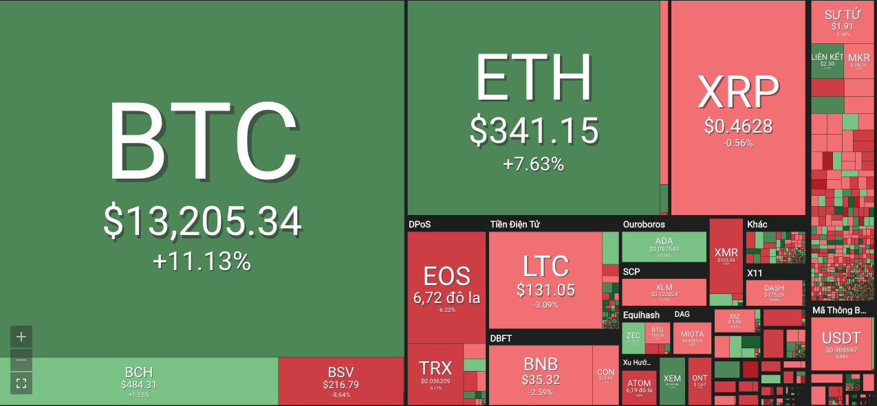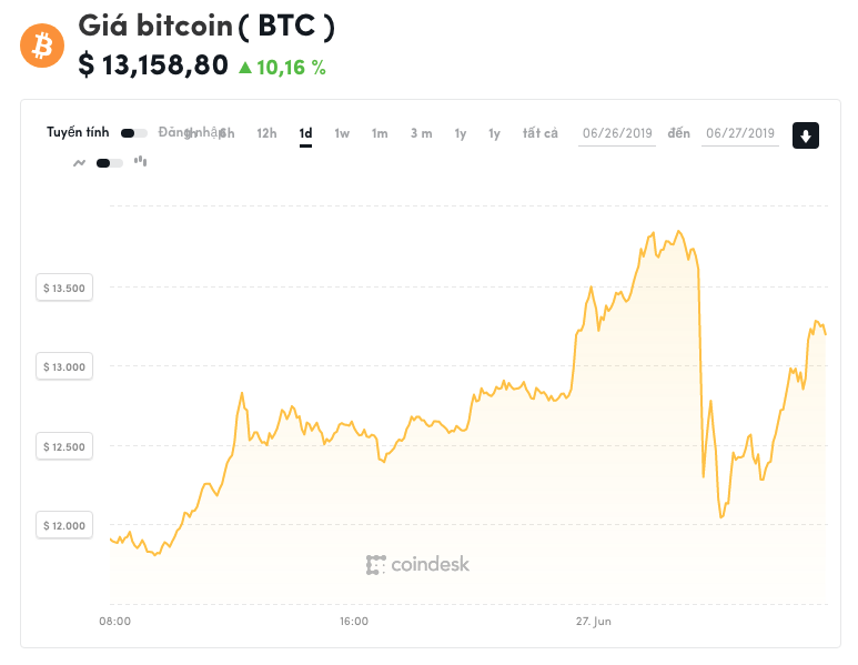 Giá bitcoin hôm nay 27/6 ghi nhận vào thời điểm 8h00 ở mức 13,158,80 USD, tăng 10,16% so với 24 giờ trước. So với đỉnh cao trong ngày vào lúc 2h59, giá bitcoin hôm nay giảm 7,55% chỉ trong 2 giờ.