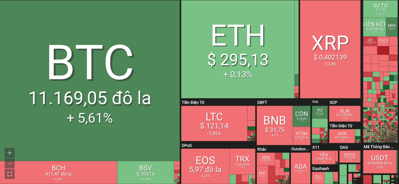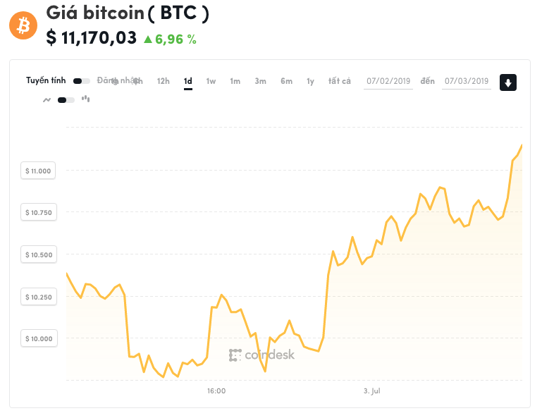 Giá bitcoin hôm nay 3/7 ghi nhận vào thời điểm 7h40 ở mức 11.170,03 USD, tăng 3,1% so với 24 giờ trước.