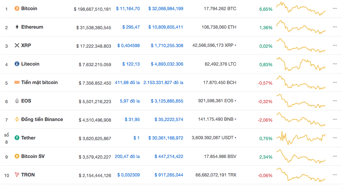 Binance coin giảm mạnh nhất trong top 10 khi mất đến 2,06%, giá của một đồng tiền này hiện ở mức 31,95 USD.