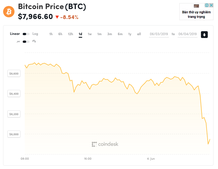 Giá bitcoin hôm nay 4/6 ghi nhận vào thời điểm 7h430 ở mức 7.966,60 USD, giảm 8,54% so với 24 giờ trước.