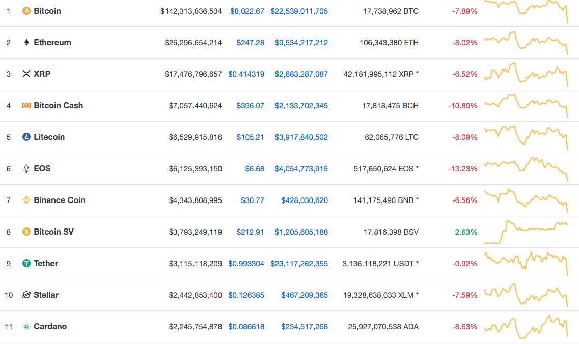 Có 82/100 đồng tiền giảm giá trong những đồng tiền hàng đầu theo giá trị thị trường. Ở chiều tăng giá, bitcoin SV dẫn đầu thị trường.