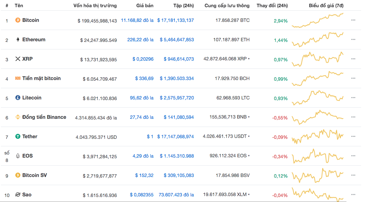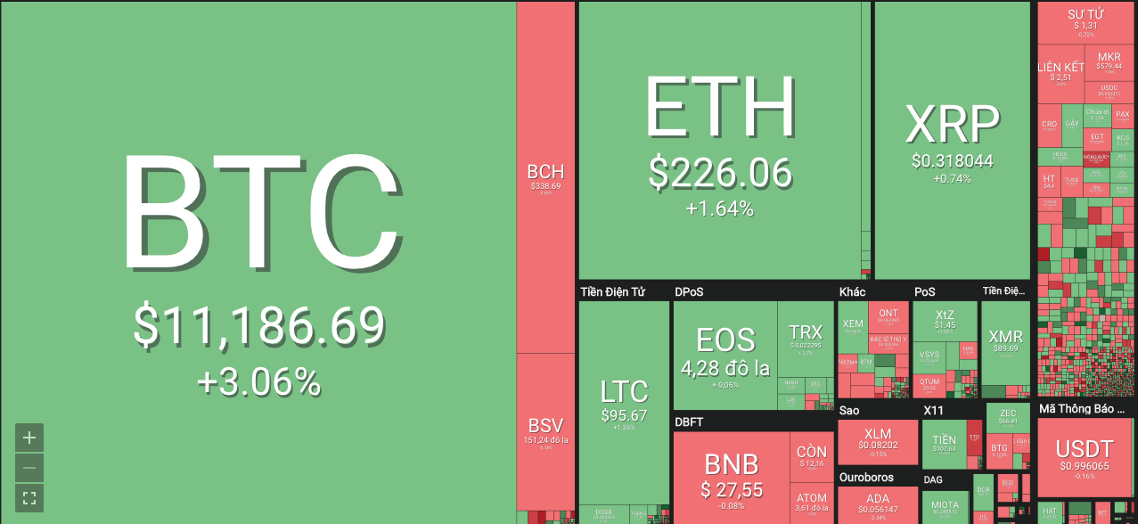 Giá bitcoin hôm nay ghi nhận vào thời điểm 8h00 ở 11.204,56 USD, tăng 3.30% so với 24 giờ trước.