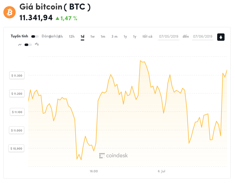 Giá bitcoin hôm nay 6/7 ghi nhận vào thời điểm 8h00 ở mức 11.341,94 USD, tăng 1,47% so với 24 giờ trước.
