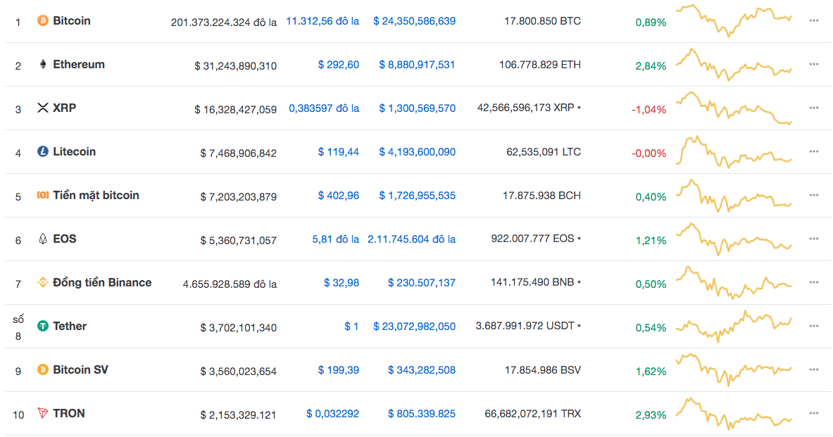 Trong nhóm 10 đồng tiền hàng đầu theo giá trị thị truòmg, có 8/10 đồng tiền tăng giá so với 24 giời trước.