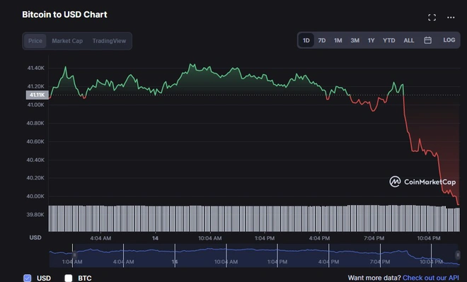 Theo dữ liệu từ Coinmarketcap, Bitcoin (BTC) đang được giao dịch quanh mốc 39.800 USD. Trong cả ngày 14/4 (giờ Việt Nam), giá đồng tiền mã hóa lớn nhất thế giới gần như luôn trên mốc 41.000 USD. Tuy nhiên, đến 20h30, BTC bất ngờ giảm mạnh, mất giá gần 1.400 USD. So với 24 giờ trước đó, Bitcoin đã giảm hơn 3% giá trị vốn hóa.