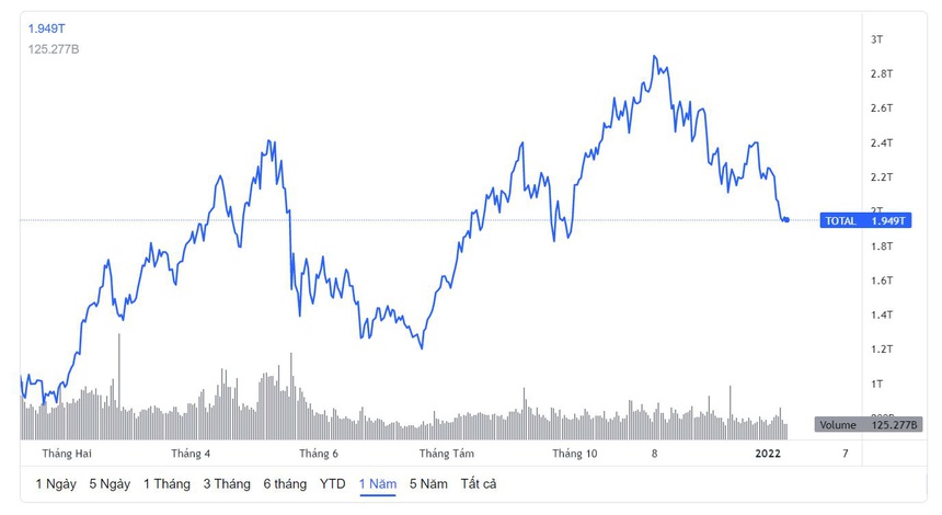 Tổng vốn hóa thị trường của tiền mã hóa tại thời điểm hiện tại là 1,96 nghìn tỷ USD, giảm gần 1 nghìn tỷ kể từ mức cao nhất. Đồng tiền này đã tụt 28.000 USD so với mức cao nhất là gần 69.000 USD vào đầu tháng 11/2021.