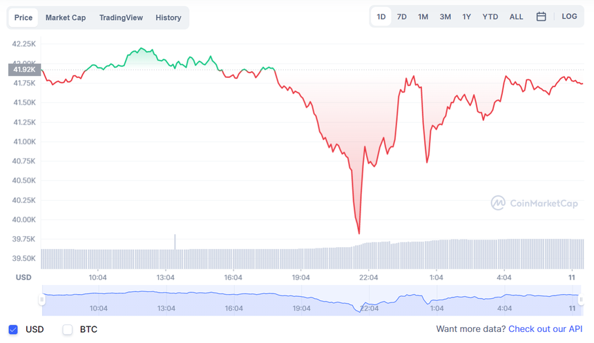 Bitcoin đã trải qua quãng thời gian không mấy suôn sẻ khi giảm còn 41.758 USD vào sáng 11/1. Theo CoinMarketCap, vào tối 10/1 giá Bitcoin có lúc giảm xuống còn dưới 40.000, mức thấp nhất kể từ tháng 9/2021.