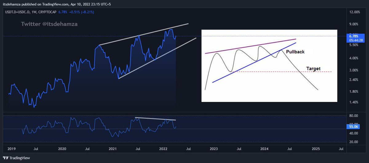 Cộng gộp thị phần của cả USDT và USDC là hai stablecoin có sức ảnh hưởng lớn hiện nay, và quan sát biến động của cả hai dưới mô hình phân tích kỹ thuật, chúng ta thấy như sau: