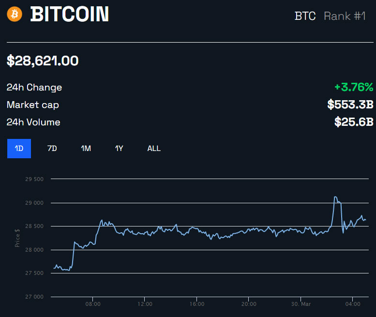 BTC đạt mức giá cao nhất trong 9 tháng vào rạng sáng ngày 30/3. Loại tiền điện tử được xếp hạng hàng đầu theo vốn hóa thị trường đã đạt đỉnh 29,000 USD trong một thời gian ngắn trước khi giảm nhẹ. Tại thời điểm viết bài, BTC được giao dịch ở mức 28,621 USD, sau mức tăng hàng ngày là 3.7%.