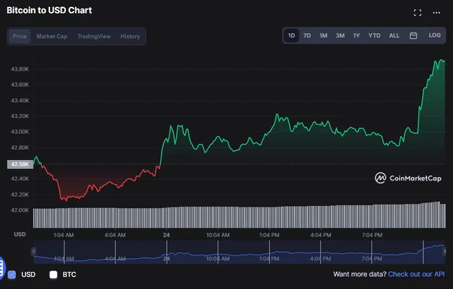 Tối 24/3, giá Bitcoin bật tăng từ mốc 42.828 USD lên 43.940 USD. Đợt tăng giá này nâng vốn hóa Bitcoin lên mốc 831,6 tỷ USD. Khối lượng giao dịch 24 giờ của đồng tiền mã hóa này tăng hơn 24%, chạm mốc 32,6 tỷ USD.