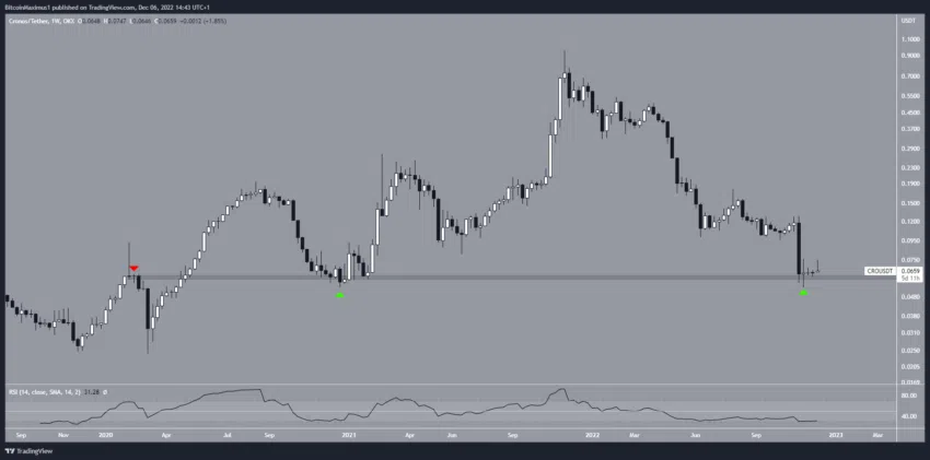 Mặc dù không có dấu hiệu đảo chiều tăng rõ ràng, nhưng điều đáng nói là chỉ số RSI hàng tuần gần như ở mức thấp nhất mọi thời đại. Nó ở mức tương tự như vào tháng 12/2020 (vòng tròn màu xanh lá cây), khi chuyển động đi lên dẫn đến mức cao nhất mọi thời đại bắt đầu. Một sự đột phá và đóng nến tuần dưới vùng hỗ trợ 0.06 USD sẽ làm mất hiệu lực dự báo giá Cronos (CRO) tăng này.