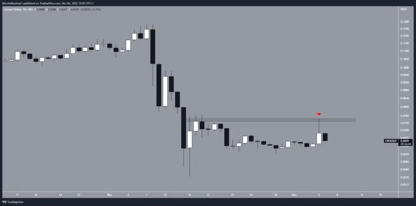 Dựa theo phân tích kỹ thuật từ biểu đồ hàng ngày, chúng ta thấy rằng giá Cronos (CRO) đã tạo ra một nến tăng vào ngày 14/11 và tạo ra mức thấp cao hơn 10 ngày sau đó. Về mặt giảm giá, nó đã tạo ra một bấc trên rất dài vào ngày 05/12 (biểu tượng màu đỏ), xác nhận khu vực 0.075 USD là mức kháng cự trong quá trình này. Do đó, hướng của xu hướng trong tương lai sẽ được xác định bằng việc liệu giá Cronos (CRO) có phá vỡ vùng hỗ trợ dài hạn 0.06 USD hay không.