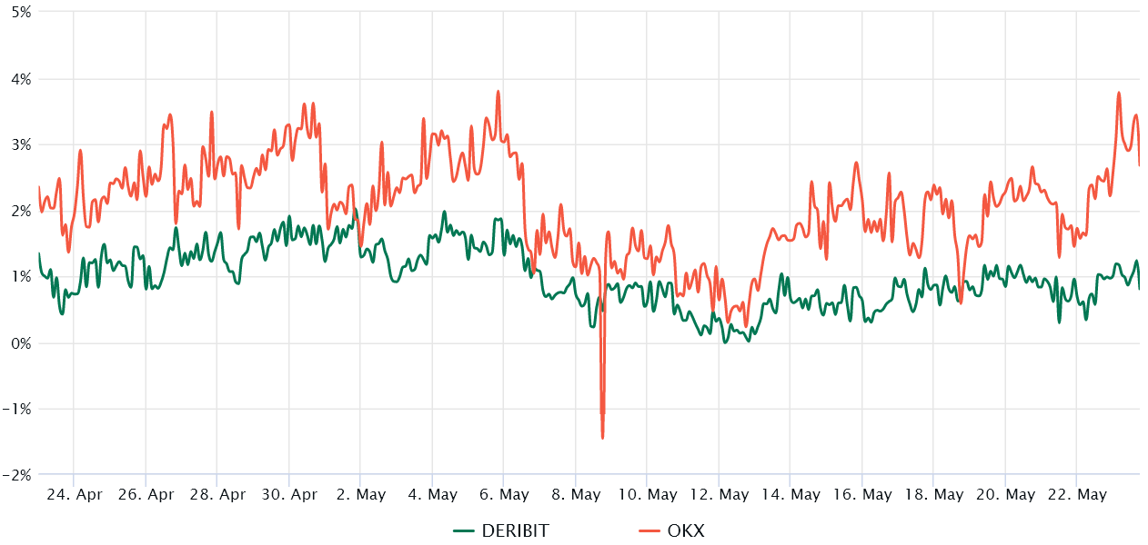 Hợp đồng tương lai hàng quý của Ether rất phổ biến đối với cá voi và bàn chênh lệch giá. Tuy nhiên, các hợp đồng tháng cố định này thường giao dịch với giá cao hơn một chút so với thị trường giao ngay, cho thấy rằng người bán đang yêu cầu thêm tiền để trì hoãn việc thanh toán.