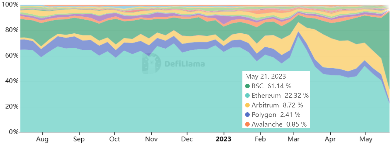 Thị phần DEX của mạng Ethereum đã giảm mạnh từ mức cao nhất 75,5% vào ngày 5 tháng 3 xuống còn 22,3% vào ngày 21 tháng 5. Trong khi đó, BNB Smart Chain là người hưởng lợi nhiều nhất, tăng từ 5,6% lên 61,1%.