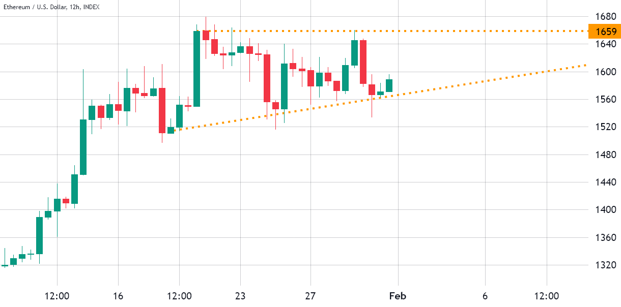 Ether (ETH) đã vật lộn với mức kháng cự 1.680 USD kể từ ngày 20 tháng 1. Tuy nhiên, mô hình tam giác tăng dần và sự cải thiện trong tâm lý nhà đầu tư đối với các công cụ phái sinh ETH mang lại hy vọng rằng giá Ether có thể đạt 1.800 USD hoặc cao hơn vào cuối tháng 2. Tất nhiên, điều này phụ thuộc vào cách giá Ether hoạt động khi nó đạt đến thời hạn của mô hình vào giữa tháng Hai.