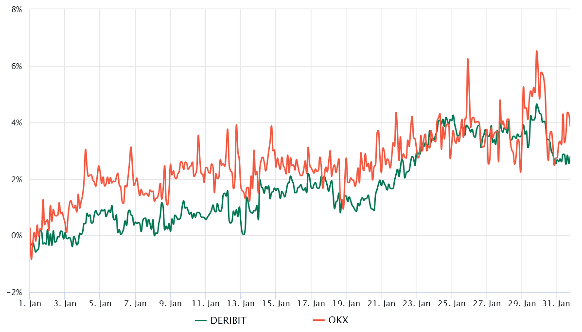 Delta skew đã ổn định gần 0% trong hai tuần qua, báo hiệu rằng các nhà giao dịch quyền chọn Ether giữ tâm lý trung lập. Điều đó đặc biệt hấp dẫn vì ETH đã tăng 10% vào ngày 20 tháng 1 — cho thấy các nhà giao dịch chuyên nghiệp đang định giá rủi ro tăng và giảm tương tự.