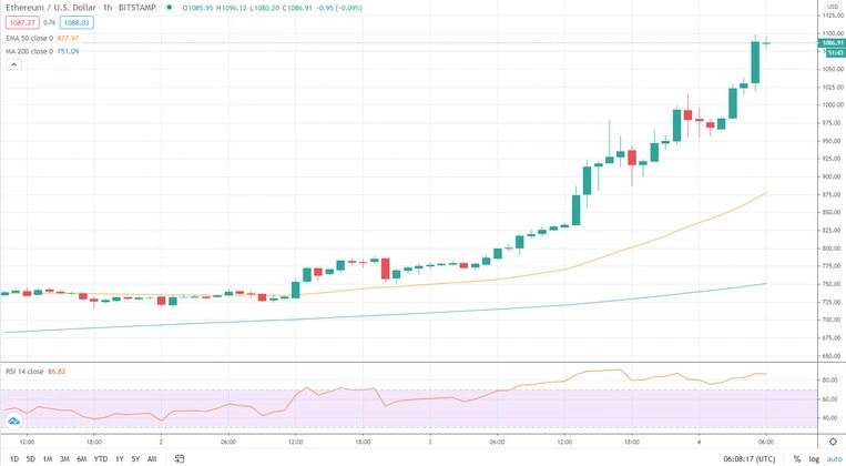 Giá ETH đã đứng đầu ở mức 1.100 đô la khoảng một giờ trước, tăng thêm khoảng 330 đô la kể từ cùng thời điểm ngày hôm qua.