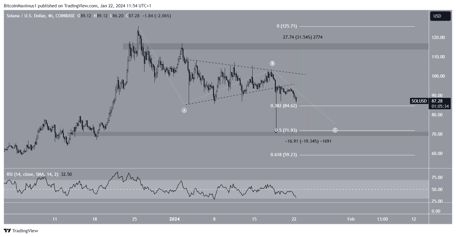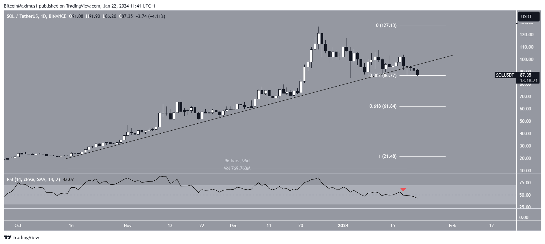 Tuy nhiên, giá SOL đã giảm kể từ đó. Vào ngày 19/1/2024, nó đã phá vỡ khỏi đường xu hướng hỗ trợ tăng dần. Vào thời điểm đó, đường xu hướng đã tồn tại được 96 ngày. Hiện tại, SOL giao dịch bên trong mức hỗ trợ thoái lui Fib 0,382.