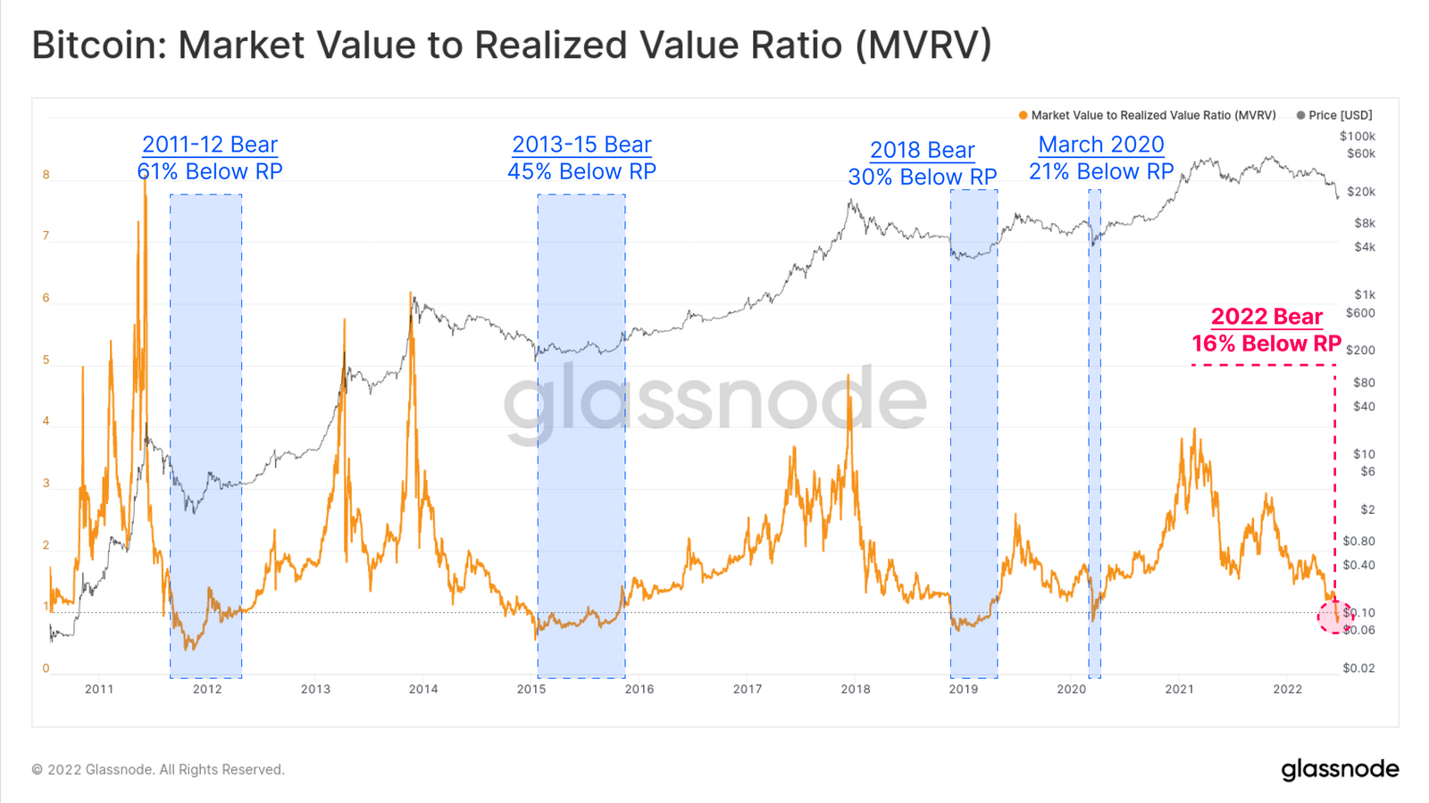 Việc xác nhận mức độ nghiêm trọng của các điều kiện thị trường hiện tại là giá giao ngay giảm xuống dưới giá thực tế (realized price), điều này đã buộc các nhà giao dịch ngày càng phải bán tiền của họ với mức lỗ. Glassnode lưu ý rằng hiệu ứng thác nước như vậy là “điển hình của thị trường gấu và đầu hàng (capitulation) của thị trường”.