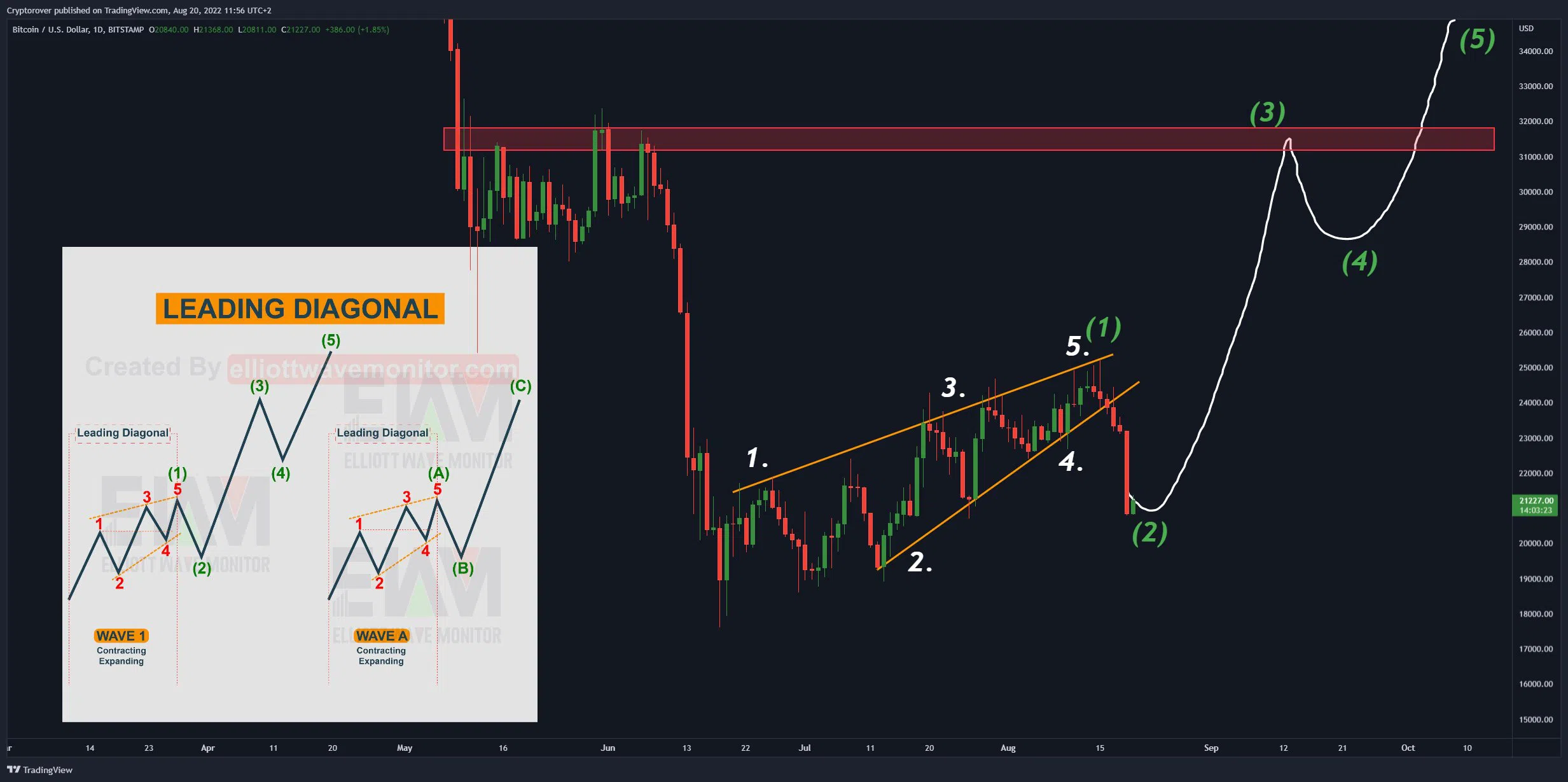 Trong lý thuyết song Elliot, sóng 3 là sóng dễ nhận thấy, nhưng sóng 1 là sóng khó nhận ra nhất. Người ta thường nhầm lẫn sóng 1 với sóng hồi của xu hướng trước đó. Crypto Rover (@rovercrc) với hơn 325,000 followers cho rằng giá BTC chỉ đang tạo mô hình Leading Diagonal.