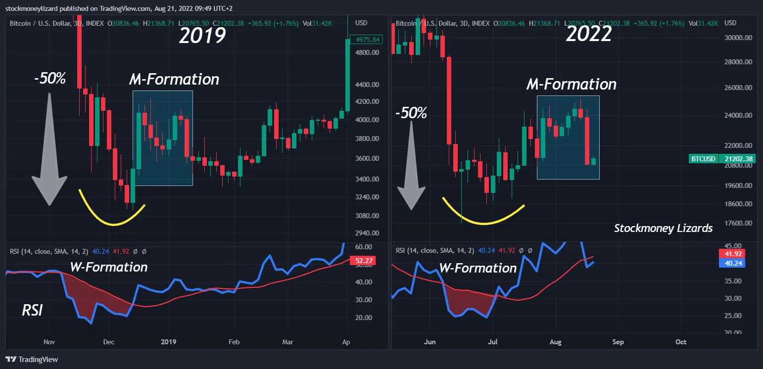 - Trước đó, Stockmoney Lizards cũng cho rằng nhịp giảm này của Bitcoin có khả năng tạo mô hình 2 đáy trong khung 5D, tương tự cách biến động của năm 2014 – 2016.