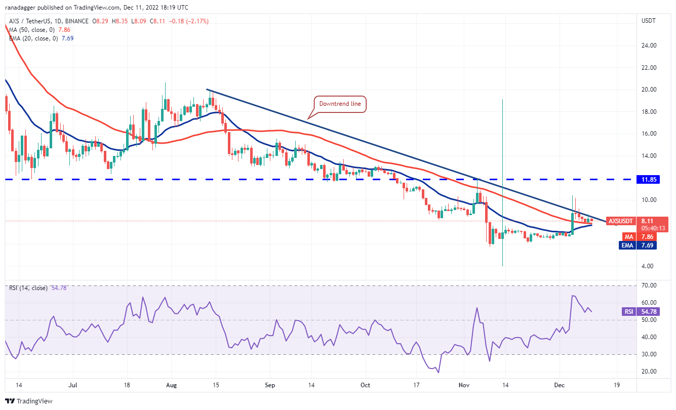 Axie Infinity (AXS) đã ở trong một xu hướng giảm mạnh nhưng nó đang cho thấy những dấu hiệu đầu tiên của sự thay đổi xu hướng tiềm năng. Người mua đã đẩy giá lên trên đường xu hướng giảm vào ngày 5 tháng 12 nhưng không thể duy trì mức cao hơn, như được thấy từ bấc dài trên thanh nến của ngày.