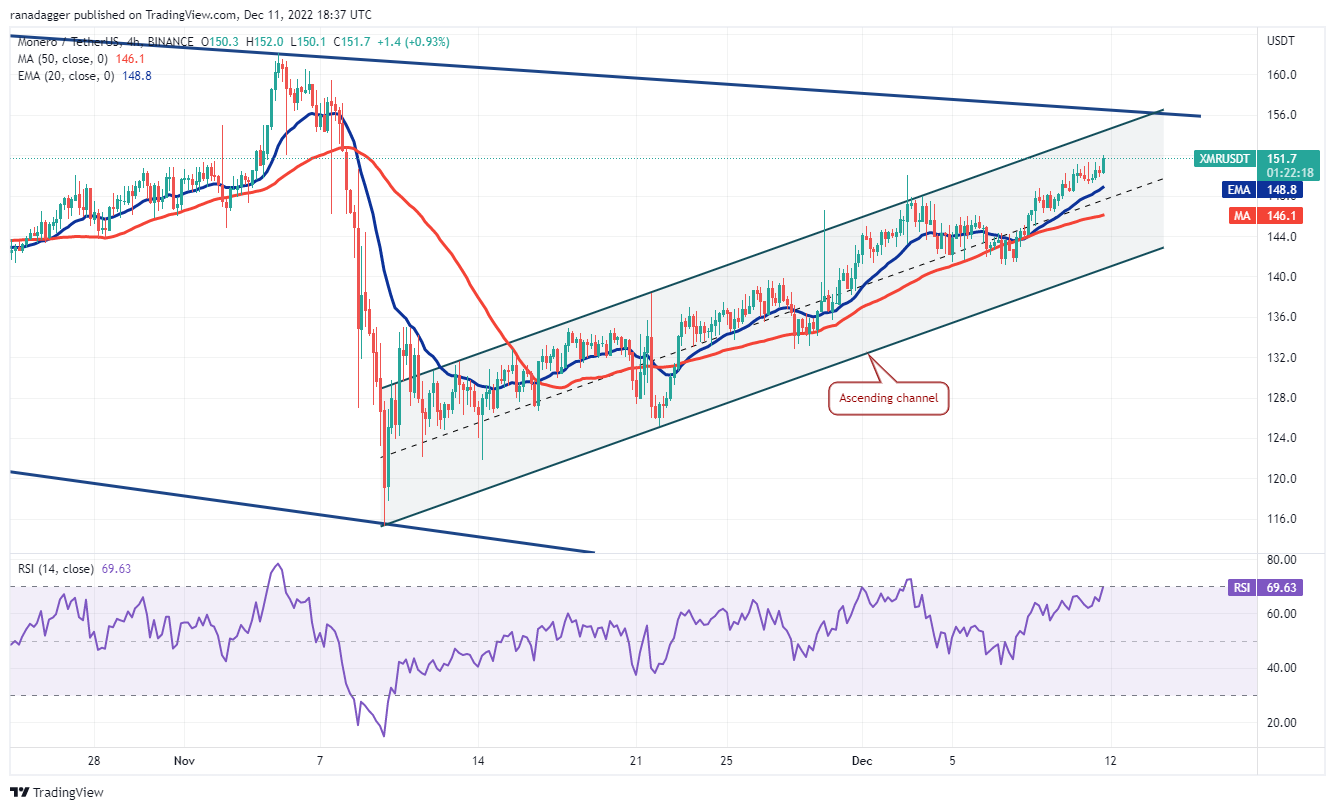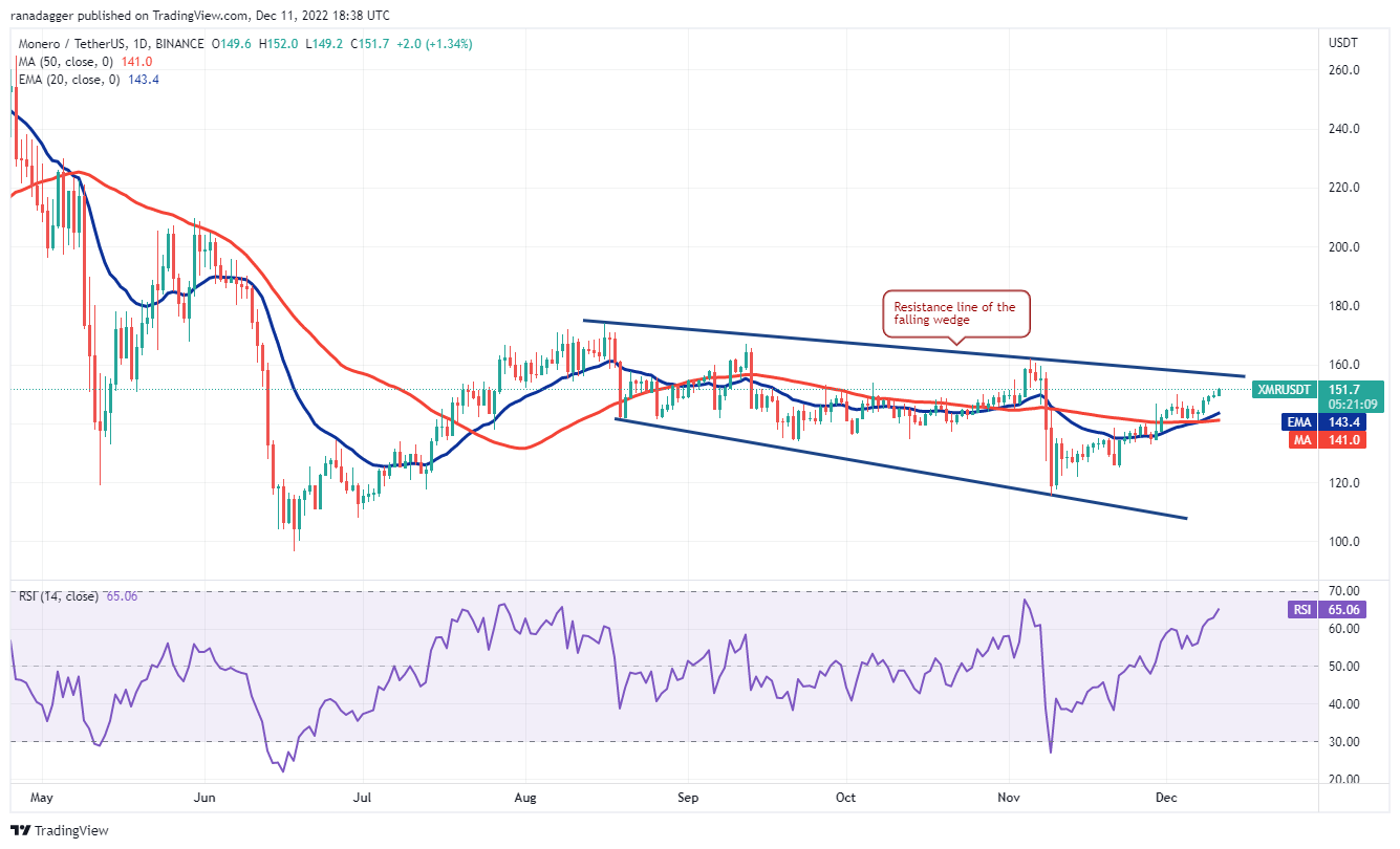 Monero (XMR) đã giao dịch bên trong mô hình nêm giảm trong vài ngày qua. Đường EMA 20 ngày dốc lên (143 USD) và chỉ số RSI trong vùng tích cực cho thấy phe bò có lợi thế hơn.