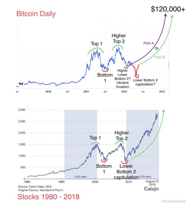 Ví dụ như phân tích của EmmyMoonie, đã vẽ nên hai kịch bản cho giá Bitcoin kể từ lúc này. Tạm bỏ qua kịch bản tích cực là giá sẽ tăng kể từ đây (path A), thì kịch bản tiêu cực là ngay cả khi Bitcon tạo đáy thấp hơn đáy của hồi năm ngoái đi nữa, thì khả năng tăng trưởng trở lại như mô típ của cổ phiếu giai đoạn 2010 không phải là không có (path B).