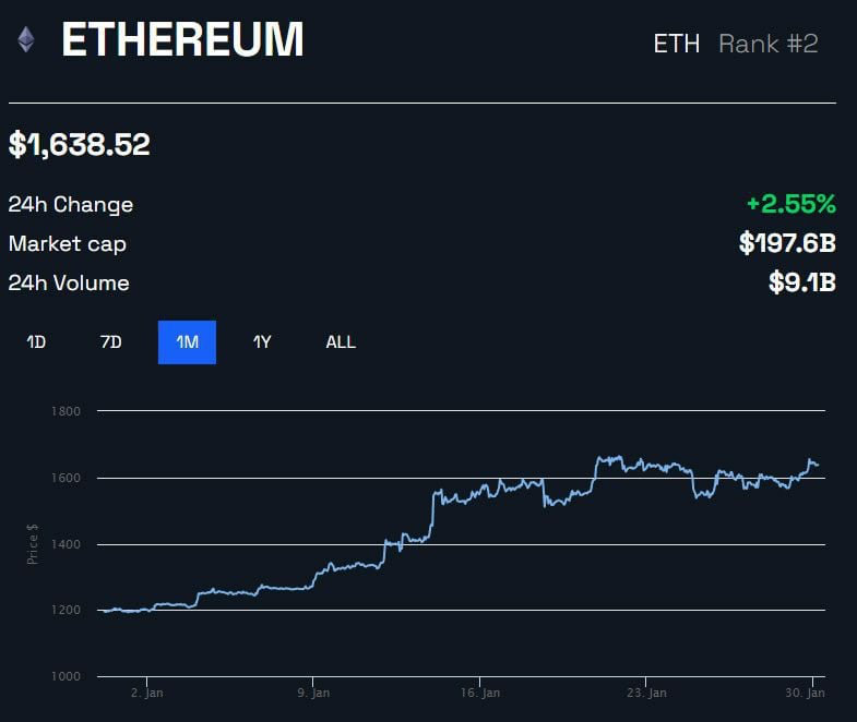Tại thời điểm viết bài, giá ETH tăng 1.6%, được giao dịch với giá 1,568 USD vào đầu giờ ngày 30/1. Hơn nữa, ETH đã đạt mức cao nhất trong 12 tuần là 1,658 USD vài giờ trước. Đạt mức tăng 36.7% trong tháng qua, từ dưới 1,200 USD vào đầu năm.