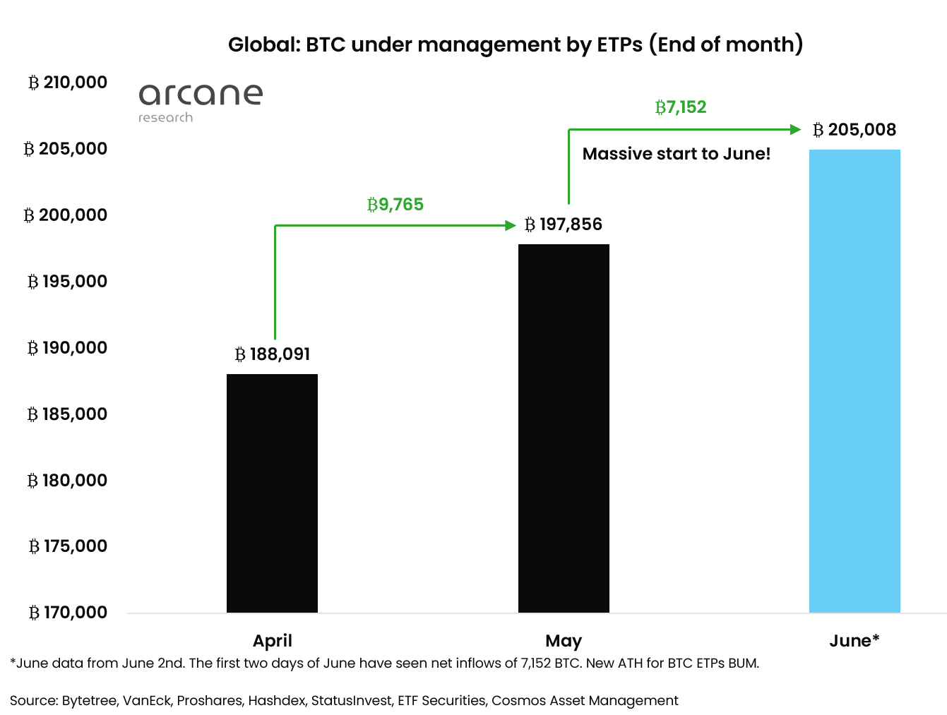 Chỉ trong vài ngày đầu tiên của tháng 6, hơn 7.000 BTC đã chảy vào ETP, gần bằng cả tháng 5.