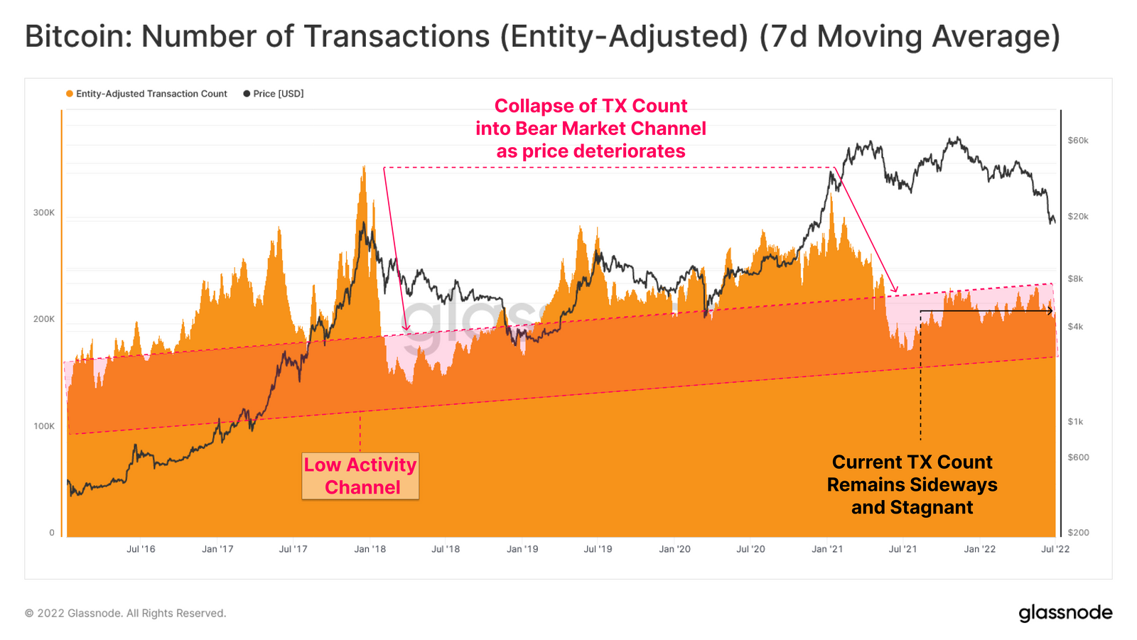 Hoạt động địa chỉ đã giảm từ hơn 1 triệu địa chỉ hoạt động hàng ngày vào tháng 11 năm 2021 xuống còn khoảng 870.000 địa chỉ mỗi ngày trong tuần qua. Tương tự, các thực thể đang hoạt động, tập hợp nhiều địa chỉ thuộc sở hữu của cùng một cá nhân hoặc tổ chức, hiện có khoảng 244.000 mỗi ngày, mà Glassnode cho biết là “Hoạt động thấp” điển hình của thị trường gấu.
