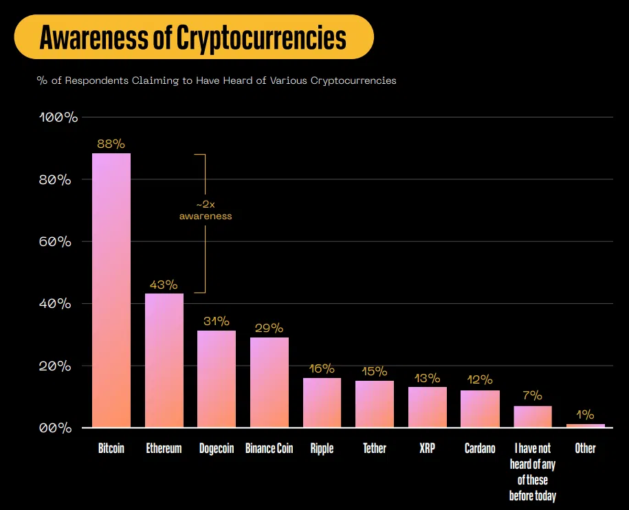 Chỉ có 7% nói rằng họ chưa từng nghe đến tiền mã hóa. Có đến 88% đã nghe đến Bitcoin. Tiền mã hóa nói chung và Bitcoin nói riêng đã qua rồi giai đoạn mà nhiều người phải tìm kiếm “Bitcoin là gì?”. Thế hệ càng trẻ thì sự hiểu biết về tiền mã hóa càng sâu sắc.