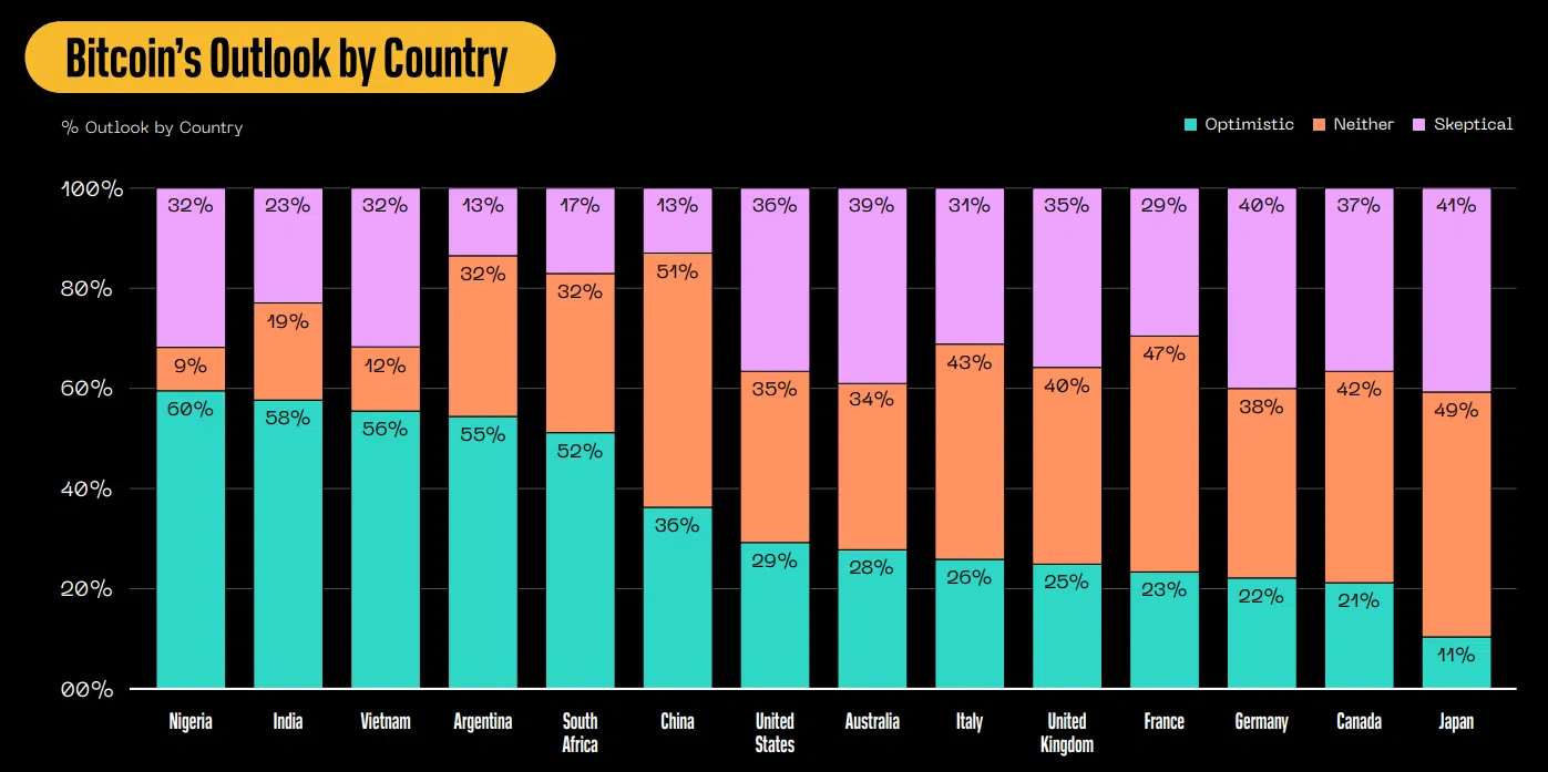 - Nhóm các quốc gia lạc quan nhất về Bitcoin (hơn 50%) là Nigeria, Ấn Độ, Việt Nam, Argentina, Nam Phi. Nhóm ít lạc quan hơn (từ 36% trở xuống) thì thuộc về những quốc gia có bình quân đầu người cao (Mỹ, Châu Âu, Úc, Nhật, Trung Quốc).