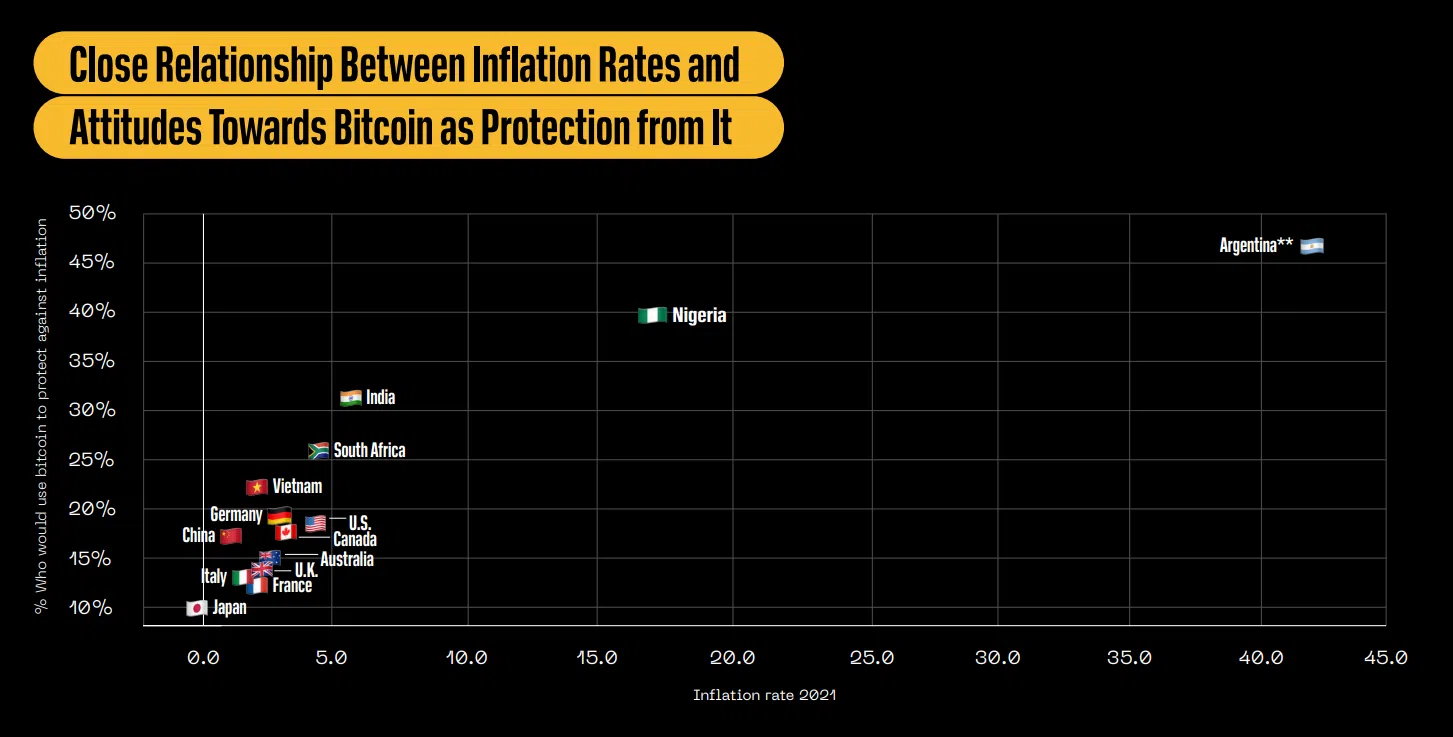 - Cao nhất 45% tin tưởng khả năng chống lạm phát của Bitcoin, đó là tại Argentina. Tiếp đến, 40% tin tưởng vào Bitcoin sẽ giúp họ chống lạm phát, đó là tại Nigeria. Hai quốc Argentina và Nigeria là hai quốc gia có tỷ lệ lạm phát 2021 cao nhất nhóm khảo sát.