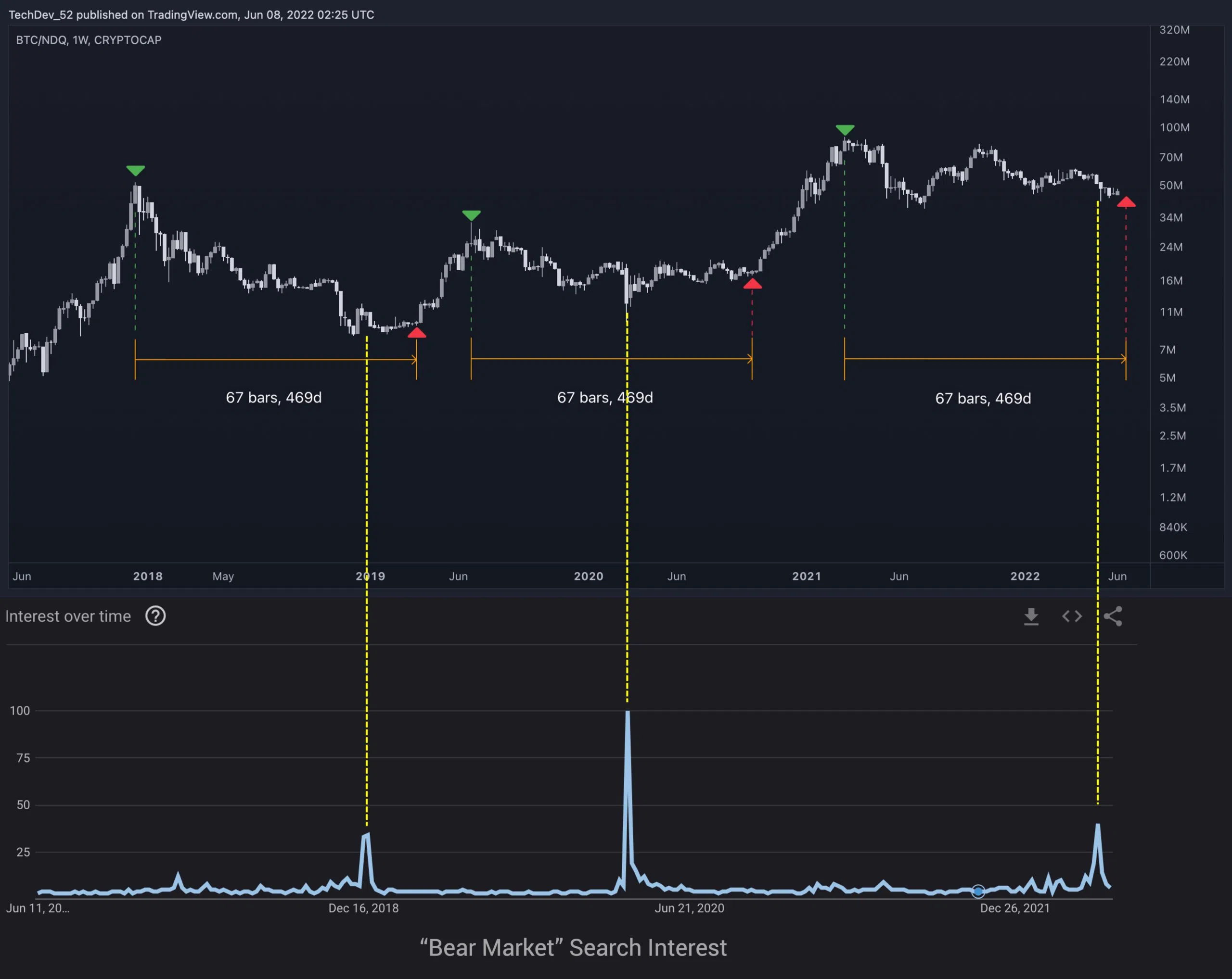 Tài khoản @TechDev_52 đã so sánh mối quan tâm về thị trường gấu với vốn hóa thị trường và cho ra kết quả như sau: