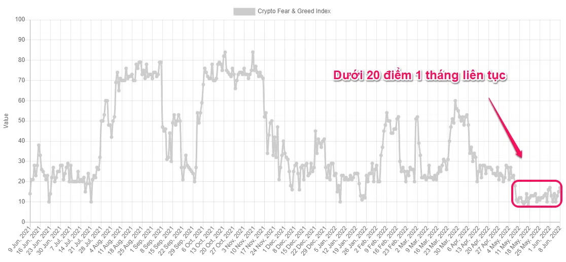 Lý do là vì Bitcoin chưa từng trải qua một đà giảm nào kéo dài đến 9 tuần liền mà giá không phục hồi như vừa qua. Thông thường, chỉ số tham lam sợ hãi về dưới 20 điểm rồi chạm 10 điểm chỉ trong một thời gian ngắn và phục hồi ngay. Nhưng liên tục dưới 20 điểm là điều chưa từng có, không chỉ trong 2021 mà cả từ 2018 đến nay.