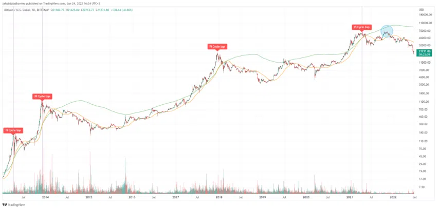 ATH duy nhất trong mà Pi Cycle Top không dự đoán được là ATH gần đây nhất. Vào ngày 10 tháng 11 năm 2021, khi BTC đạt 69,000 USD, chỉ báo đã không tạo được tín hiệu nhấp nháy như thường lệ. Vào thời điểm đó, điều này được hiểu là một dấu hiệu cho thấy làn sóng thứ hai của thị trường tăng giá vẫn chưa kết thúc. Hôm nay chúng ta biết rằng chỉ báo không có hiệu lực trong trường hợp này.