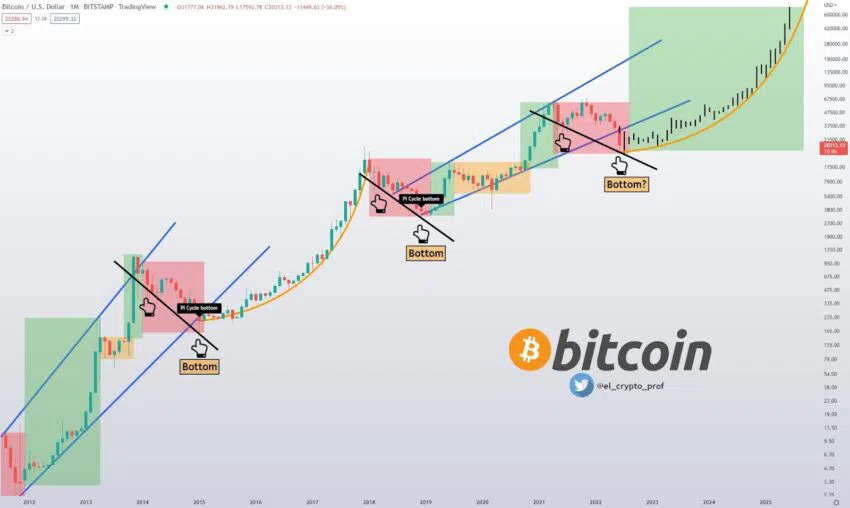 Một nhà phân tích khác là @el_crypto_prof đã tiến thêm một bước nữa, người đã kết hợp tín hiệu tiềm năng từ Pi Cycle Bottom với phân tích fractal của các chu kỳ trước đó. Theo ý kiến của ông, nếu một đáy Bitcoin tiềm năng xảy ra trong tương lai gần, nó sẽ rất phù hợp với các phép tính tương tự giữa các chu kỳ trước đó.