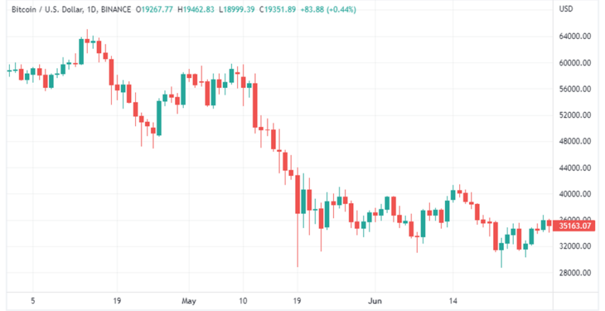 Vào tháng 6 năm 2021, khối lượng giao dịch Bitcoin là khoảng 1,19 nghìn tỷ USD, với 58,96 tỷ USD là mức cao nhất trong một ngày của tháng. Bất chấp dự báo tăng giá của một số nhà bình luận thị trường cho tháng 6, BTC tiếp tục xu hướng giảm bằng cách giao dịch trong phạm vi 17.708,62 USD và 31.957,28 USD. Khối lượng giao dịch BTC là khoảng 923,94 tỷ USD và mức cao nhất trong một ngày là 68,2 tỷ USD đã được ghi nhận trong khoảng thời gian này.