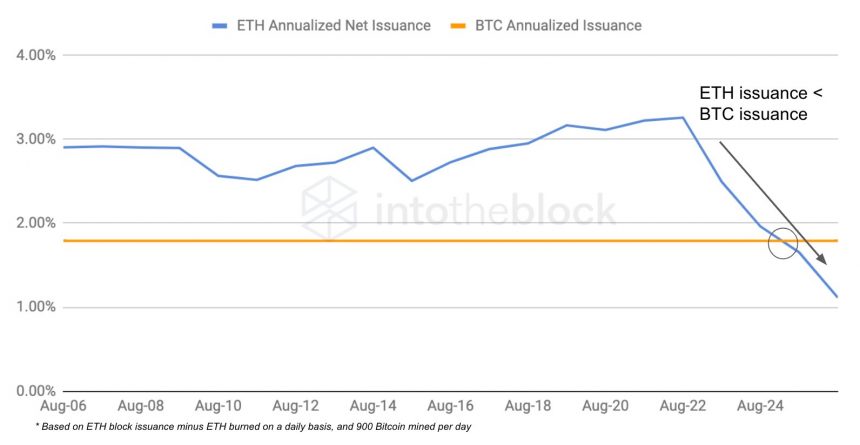 Do đó, đối với một số chuyên gia, ETH đã và đang đạt được sức hút như một kho lưu trữ tài sản giá trị, thậm chí còn hiệu quả hơn cả Bitcoin. Nhà nghiên cứu Lucas Outumuro đã ghi nhận sự sụt giảm trong đợt phát hành hàng ngày của ETH, lần đầu tiên thấp hơn so với Bitcoin kể từ khi ra đời.