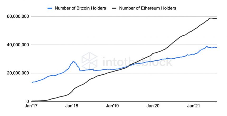 Dữ liệu bổ sung cũng cho thấy ETH được chấp nhận nhiều hơn với gần 60 triệu địa chỉ nắm giữ nó so với gần 40 triệu của BTC. Nghiên cứu nhấn mạnh những địa chỉ đó không giúp xác định số lượng người dùng vì một người có thể sở hữu nhiều địa chỉ nhưng có thể được sử dụng như một “proxy để quan sát sự phát triển trong cộng đồng tài sản tiền điện tử”.