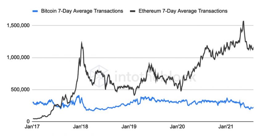 Số lượng giao dịch hàng ngày của Ethereum cao gấp 5 lần Bitcoin, nhưng vẫn bị tụt hậu về định giá.