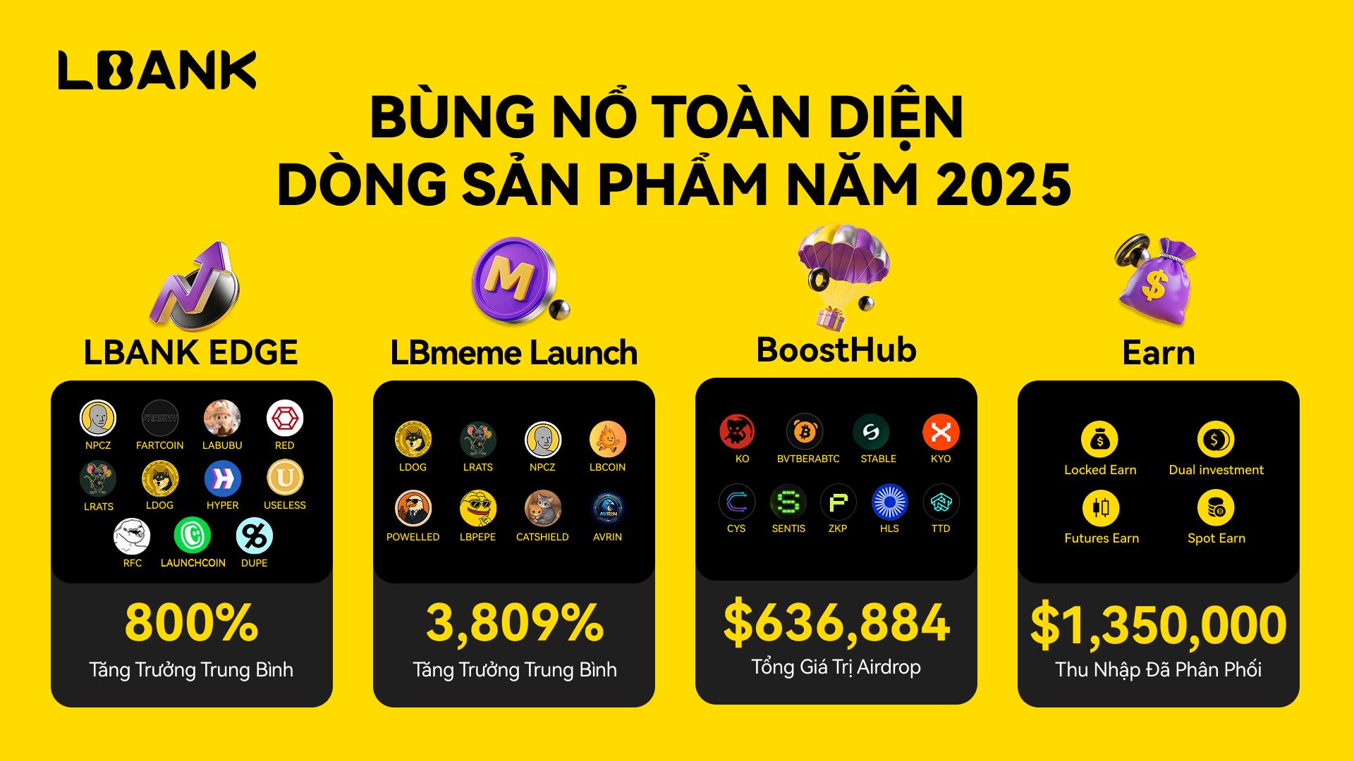 LBank tiếp tục khẳng định vị thế dẫn đầu ngành trong việc phát hiện tài sản tiềm năng cao. Trong năm 2025, nền tảng đã niêm yết 1.191 token, trong đó các dự án ra mắt độc quyền chiếm 40,47%. Có 16 tài sản đạt mức tăng 100x (chiếm 1,34%), trong khi Top 10 dự án mới có mức lợi nhuận trung bình lên tới 762x. Các tài sản trong khu vực LBANK EDGE ghi nhận mức tăng trung bình 800%, còn các token ra mắt qua LBmeme Launch đạt mức tăng trung bình 3.809%. Các dự án như LAUNCHCOIN (152x), BLUM (123x), HYBER (119x), DUPE (133x) và RFC (108x) đều ra mắt độc quyền trên LBank.