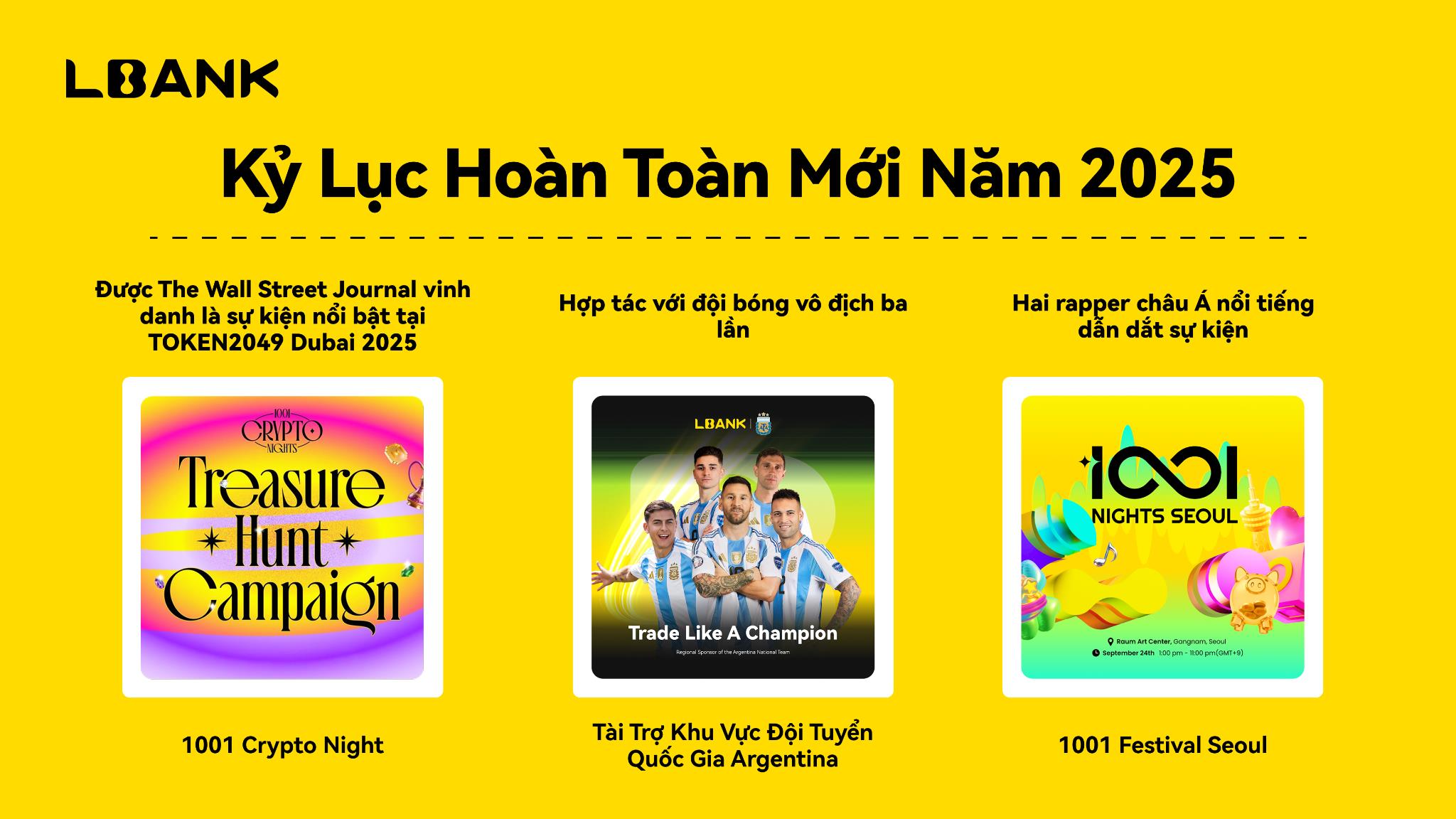Ngoài giao dịch và đổi mới sản phẩm, LBank còn mở rộng mạnh mẽ tầm ảnh hưởng trong cả ngành crypto và xã hội đại chúng. Bên cạnh tài trợ đội tuyển Argentina, LBank đã nâng cao sự hiện diện toàn cầu thông qua các sự kiện như 1001 Crypto Night, 1001 Festival Seoul và tài trợ Bitcoin 2025. Nhờ đó, LBank đã giành được nhiều giải thưởng danh giá, bao gồm “2025 Best CEX” (BeInCrypto), “Sàn CEX duy nhất đạt Double Growth năm 2025” (CoinGecko), “Top 3 Sàn Bitcoin” (Bitcoin.com News), “Top 3 Sàn Crypto” (CoinGape) và “100x Gems Hub” (CoinGecko). Forbes cũng vinh danh LBank là đơn vị dẫn đầu làn sóng meme toàn cầu.